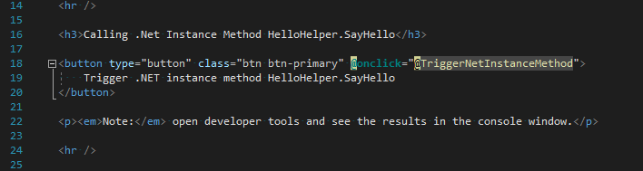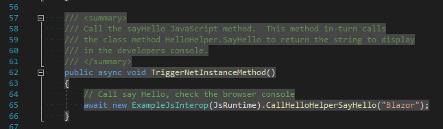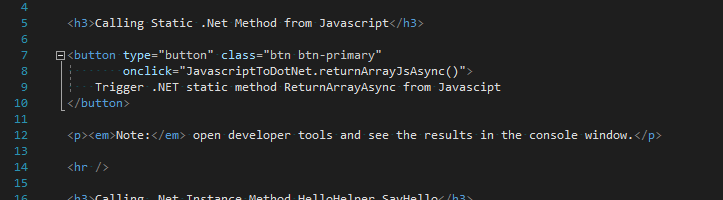 Initially we’ll look at invoking JavaScript functions from .Net. There are times when you need to access browser capabilities that are only exposed via a JavaScript library. These function(s) may be defined within the <head> element of the wwwroot/index.html (Blazor client-side), Pages/_Hosts.cshtml (Blazor server-side), or a separate JavaScript file that can be referenced. The implementation presented in this post uses a separately referenced JavaScript file located in wwwroot.