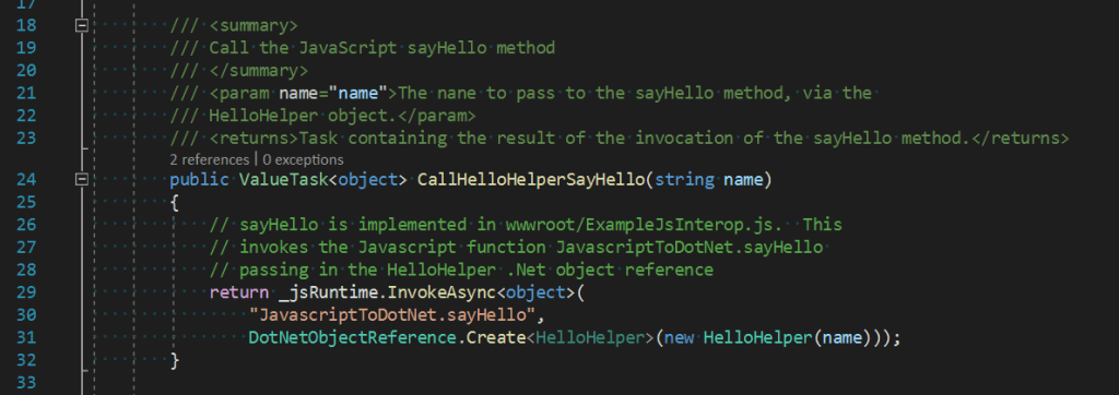 The button invokes the TriggerNetInstanceMethod. This method calls the CallHelloHelperSayHello method which creates a DotNetObjectReference object from the HelloHelper class passing in the name to return when called from JavaScript. See Figures 9 & 10 below.