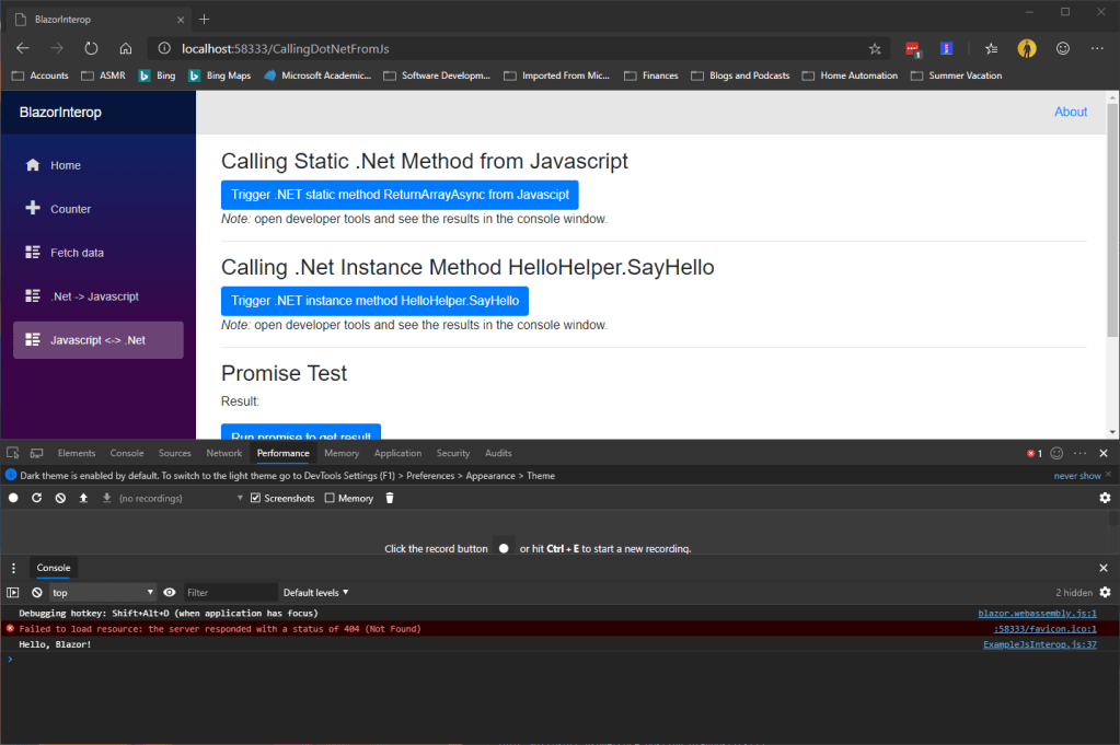 Which in-turn outputs the string “Hello Blazor!” which is then logged to the browsers developer console as shown below in Figure 12.