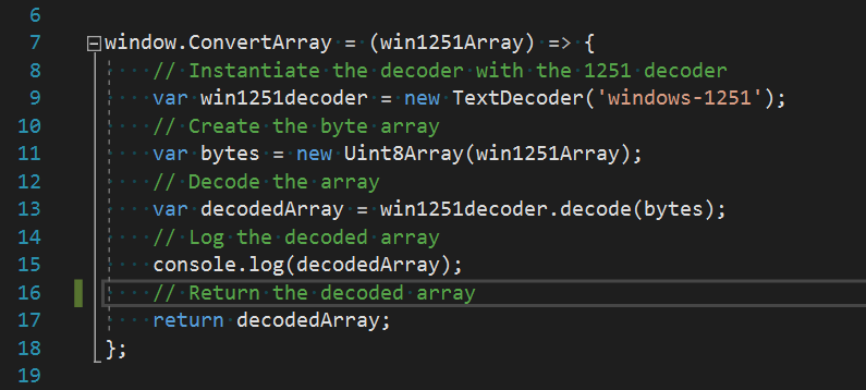 Figure 1 shows the JavaScript function that converts the unsigned int array into a string. This code is in wwwroot/ExampleJsInterop.js.