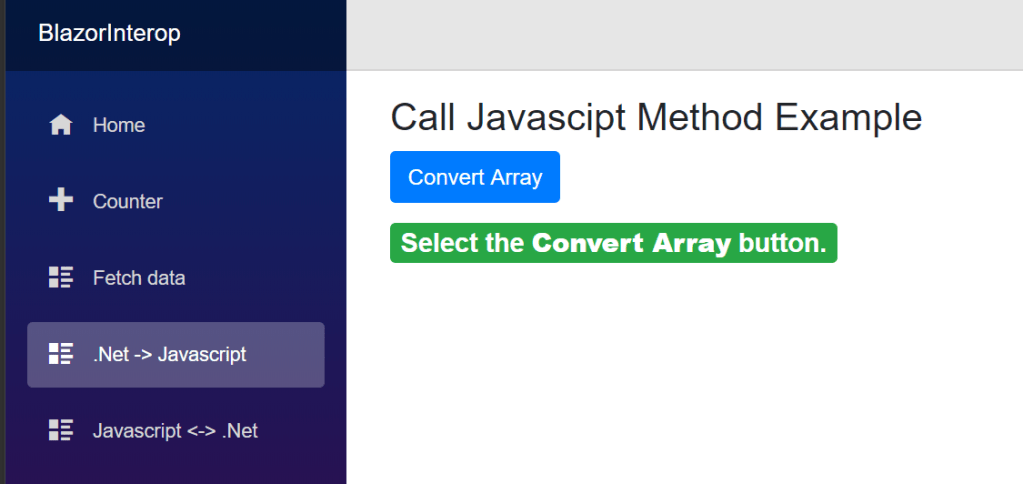 - Invoke the .Net instance methods on the instance using the invokeMethod() or invokeMethodAsync() functions. The .Net instance can also be passed as an argument when invoking other .Net methods from JavaScript.