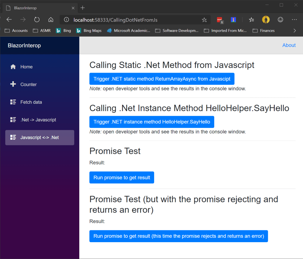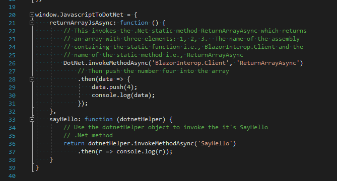 Lastly we’re going to discuss using JavaScript interoperability to process JavaScript promises from C#. There are numerous JavaScript libraries available to the browser. To more effectively interact with these libraries in Blazor, we need a way to invoke these library methods and process promises generated by these libraries that contain needed results.