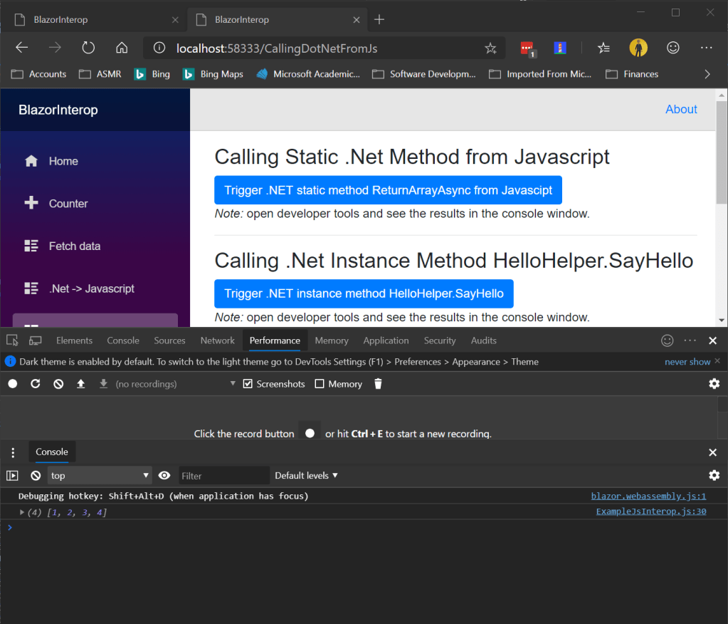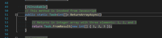 The button invokes the JavaScript function JavascriptToDotNet.returnArrayJsAsync(). See Figure 5 above. This method in-turn invokes the static method of the class BlazorInterop.Client.ReturnArrayAsync(). BlazorInterop.Client.ReturnArrayAsync() returns the array [1, 2, 3], see Figure 6 below. Once the result is returned to JavaScript function, the promise then pushes the number 4 onto the array as shown in Figure 7 below.