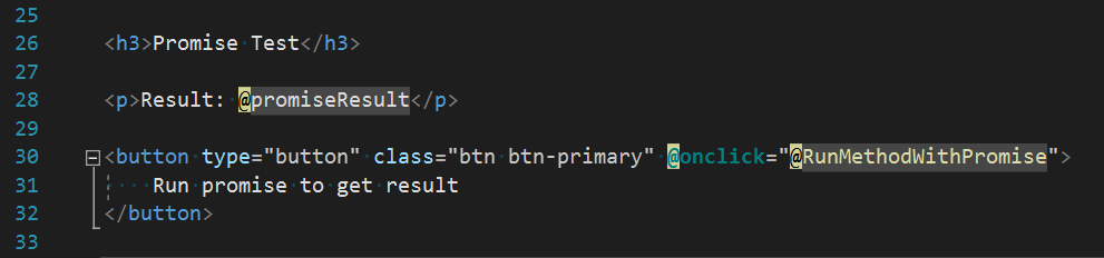 The first method we’re going to call will execute a JavaScript function that generates a promise and returns the results after a timeout of 2 seconds. The ‘Run Promise to get result’ button calls the CallFunctionWithPromise() function which creates the PromiseHandler DotNetObjectReference object and invokes the JavaScript function JavascriptWithPromises.runPromiseFunction(). See Figures 13 – 15.