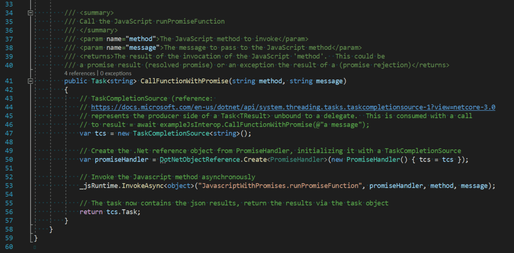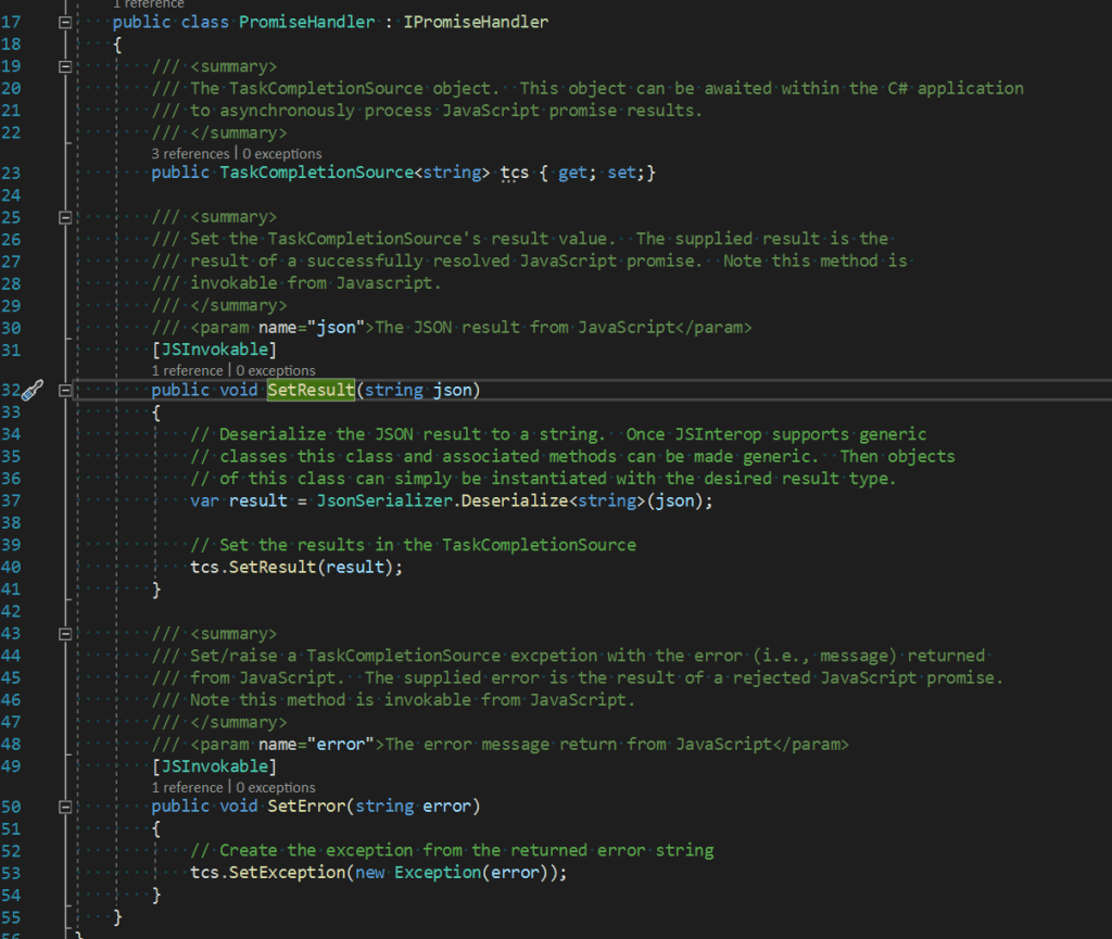 The impetus of this article is to determine how to process JavaScript promises within C#. There are features available in browsers that we may want to interact with that require us to be able to invoke JavaScript methods from C# and respond to the resulting promises returned from these JavaScript methods. This post is going to dive into the inner workings of the Microsoft.JSInterop.