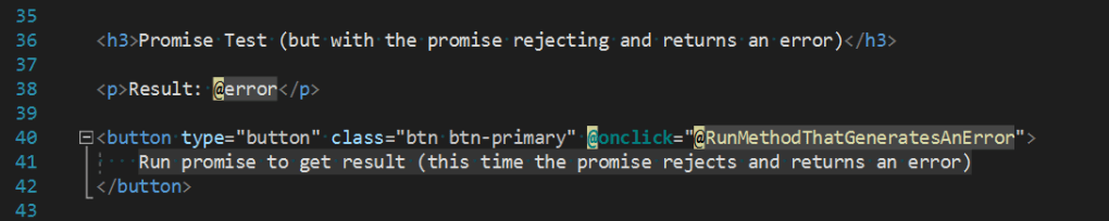 The ‘Run promise to get result (this time the promise rejects and returns an error)’ button calls the RunMethodThatGeneratesAnError() function which creates the PromiseHandler DotNetObjectReference object and invokes the JavaScript function JavascriptWithPromises.runPromiseFunction(). This time the JavaScript function called is functionThatMakesAnError(). See Figures 21 – 25.