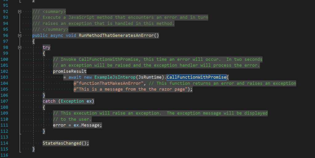 The rejected promise is then caught in the try catch block of the runPromiseFunction() function. The catch error handler then uses our C# DotNetObjectReference PromiseHandler will invoke the PromiseHandler.SetError() method to raise an exception See Figure 26. This exception is then caught in the RunMethodThatGeneratesAnError() page method, see Figure 21 and 22. The exception handler in this method then surfaces the error to be displayed on the page.