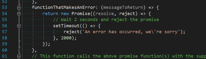 This time the JavaScript function that gets invoked will instead reject the promise after two seconds. The rejected promise will then propagate through the promise handler and set the associated error on the page.